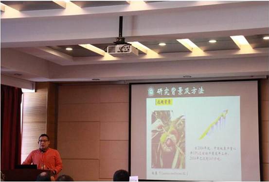2017年12月9日,稻谷及副产物深加工国家工程研究中心科研团队应邀参加华中农业大学研究生专场学术报告会。在华中农业大学食品科学技术学院承办的食品科学技术研究生专场报告会上,2015级硕士研究生陈帅以“利用水分吸附数学模型估算花桥板栗2号安全贮藏水分”为题进行学术汇报并荣获三等奖。