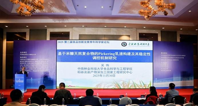在“农产品加工与质量控制”专题论坛中,吴伟教授以《基于米糠天然复合物的Pickering乳液构建及其稳定性调控机制研究》为题作学术报告,系统介绍了脱脂米糠提取米糠蛋白副产物——米糠天然复合物作为Pickering乳液稳定剂的开发策略,深入解析了酚类物质调控米糠天然复合物稳定的Pickering乳液物理稳定性和氧化稳定性的机制,创新地提出了综合利用米糠的开发策略与技术路线,获得了参会专家的高度关注和热烈讨论。