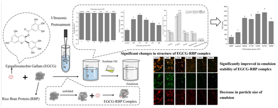 超声预处理促进了EGCG和RBP的结合。适度强度的超声预(200-425 W)处理提高了ζ-电位绝对值,使EGCG-RBP复合物的空间结构展开;而过度强度的超声预处理(500 W)降低了ζ-电位绝对值,使EGCG-RBP复合物的空间结构聚集。适度强度的超声波预处理(200-425 W)增强了EGCG-RBP复合物的乳液稳定性,而过度强度的超声波预处理(500 W)则降低了其稳定性。超声波预处理提高了EGCG-RBP复合物的ζ-电位绝对值、柔性和表面疏水性,从而增强了其乳液稳定性。优异的乳液稳定性为EGCG-RBP复合物用作乳化剂提供了有利的基础。