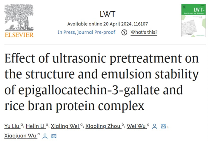 2024年4月,稻谷及副产物深加工国家工程研究中心吴伟副主任团队团队在食品领域国际期刊LWT - Food Science and Technology(Q1, IF=6.0)在线发表题为“Effect of ultrasonic pretreatment on the structure and emulsion stability of epigallocatechin-3-gallate and rice bran protein complex”的研究论文。中南林业科技大学食品与工程学院硕士研究生刘雨为第一作者,通讯作者为稻谷及副产物深加工国家工程研究中心吴伟副主任和吴晓娟高级实验师。