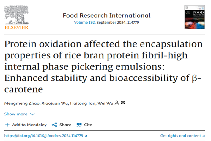 2024年7月18日,稻谷及副产物深加工国家工程研究中心吴伟副主任团队在食品领域国际期刊《Food Research International》(Q1, IF2024=7.0)在线发表题为“Proteinoxidation affected the encapsulation properties of rice bran protein fibril-high internal phase Pickering emulsions: enhanced stability and bioaccessibilityof β-carotene”的研究性论文。中南林业科技大学食品科学与工程学院2021级博士生赵萌萌为第一作者,通讯作者为稻谷及副产物深加工国家工程研究中心吴伟副主任。
