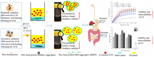 米糠蛋白(Ricebranprotein,RBP)是一种高消化率(>90%)且低致敏性的优质植物蛋白。然而,由于内源性脂肪酶的高活性,米糠(Ricebran,RB)在储存和运输过程中不可避免地发生酸败,导致RBP氧化,进而影响RBP的结构。在之前的研究中,我们发现RB酸败诱导的蛋白质氧化和酸热时间同时改变了米糠蛋白纤维(Ricebranproteinfibril,RBPF)的结构并影响了RBPF-HIPPEs的稳定性。然而,RBPF-HIPPEs作为递送系统的潜力尚未得到研究,这对于RBPF-HIPPEs作为功能性食品应用的发展至关重要。因此,为提高CE的稳定性和生物利用度,构建了负载CE的RBPF-HIPPEs。从不同贮藏时间(0~10 天)的米糠中提取不同氧化程度的米糠蛋白,通过酸加热(90℃,2~12 h)制备RBPF以稳定HIPPEs,并研究了米糠酸败诱导的蛋白质氧化对RBPF-HIPPEs 负载性能的影响。结果发现,适度氧化和适度酸热处理增强了CE-HIPPEs的稳定性和流变特性,从而提高了CE的稳定性和生物可及性。这项研究为利用蛋白质纤维聚集体基HIPPEs递送生物活性物质提供了新的视角。