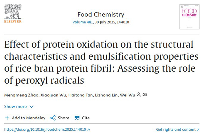 2025年3月29日,吴伟教授团队在国际食品Top期刊《Food Chemistry》(Q1,IF=8.5)在线发表题为“Effect of protein oxidation on the structural characteristics and emulsification properties of rice bran protein fibril: Assessing the role of peroxyl radicals”的研究性论文。中南林业科技大学2021级博士研究生赵萌萌为第一作者,通讯作者为稻谷及副产物深加工国家工程研究中心吴伟教授。