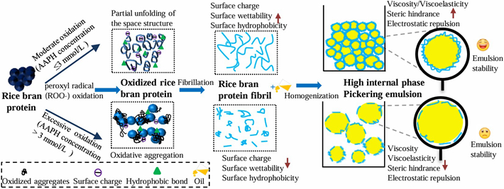 蛋白纤维是一种优异的乳化剂,具有独特的高宽比、丰富的表面活性基团和双亲性。此前,吴伟教授团队研究发现,米糠酸败诱导的蛋白质氧化会影响米糠蛋白纤维(Rice bran protein fibril,RBPF)-高内相Pickering乳液(High internal phase Pickering emulsion,HIPPE)的稳定性。米糠酸败是一种脂质过氧化反应,主要产物有脂质自由基和脂质氧化次生产物,这些产物都会诱导米糠蛋白氧化。其中过氧自由基是脂质氧化最突出、最典型的产物。2,2'-偶氮二(2-甲基丙基咪)二盐酸盐(2,2’-azobis (2-amidinopropane)dihydrochloride,AAPH)在37℃的有氧条件下培养24小时可产生过氧自由基。米糠蛋白的氧化程度随着AAPH浓度的增加而增加,过氧自由基诱导的蛋白质氧化改变了米糠蛋白的结构特征。但是,过氧自由基氧化对RBPF构象和RBPF-HIPPE稳定性的影响及其机制尚不清楚。因此,通过AAPH热解引发的过氧自由基构建了米糠蛋白氧化体系,并阐明了过氧自由基诱导的蛋白质氧化影响RBPF-HIPPE稳定性的作用机制。