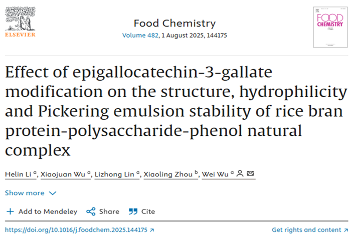 2025年4月1日,稻谷及副产物深加工国家工程研究中心吴伟教授团队在国际食品Top期刊Food Chemistry(Q1,IF=8.5)在线发表题为“Effect of epigallocatechin-3-gallate modification on the structure, hydrophilicity and Pickering emulsion stability of rice bran proteinpolysaccharide-phenol natural complex”的研究性论文。中南林业科技大学博士研究生李鹤林为第一作者,通讯作者为稻谷及副产物深加工国家工程研究中心吴伟教授。