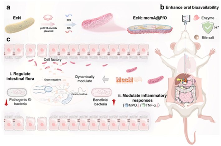 提出一种整合基因工程与化学工程的新策略,以精准调节肠道菌群并推动UC的LBT发展。该策略利用生物和化学工具对EcN进行了两种关键的改造(EcN::mcmA@P/O):(i) 基因重编程,以实现抗菌肽MccM的持续生产;(ii) 应用聚电解质复合涂层封装。这种双重工程框架使EcN::mcmA@P/O能够抵御胃肠道恶劣环境,显著提高其在胃肠道的存活率(胃部40倍,小肠74倍)。同时使工程益生菌充当“超级特洛伊木马”和“活细胞工厂”,原位持续输送MccM。MccM通过“特洛伊木马”机制靶向并结合细菌TonB依赖的外膜受体,破坏其细胞膜。在葡聚糖硫酸钠(DSS)诱导的小鼠UC模型中,EcN::mcmA@P/O有效重塑了肠道菌群,显著减轻炎症并恢复微生态平衡。重要的是,该平台的技术优势不限于疗效。其基因回路的模块化设计便于替换抗菌剂,从而适应物种特异性抗菌靶标,实现定制化治疗应用。