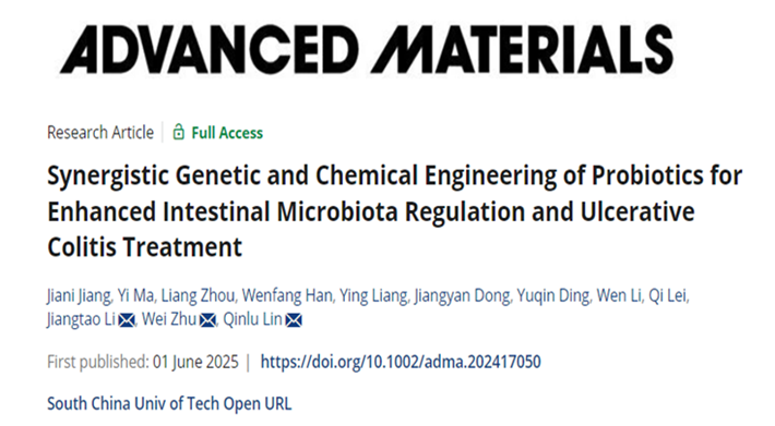 中南林业科技大学稻谷及副产物深加工国家工程研究中心林亲录教授、李江涛副教授团队在国际著名期刊《Advanced Materials》(Q1, IF=27.4)在线发表题为“Synergistic Genetic and Chemical Engineering of Probiotics for Enhanced Intestinal Microbiota Regulation and Ulcerative Colitis Treatment”的研究论文。中南林业科技大学食品科学与工程学院2020级硕士研究生江佳妮以及华南理工大学生物科学与工程学院副教授马毅为共同第一作者;稻谷及副产物深加工国家工程研究中心林亲录教授、李江涛副教授以及华南理工大学生物科学与工程学院朱伟教授为论文共同通讯作者;中南林业科技大学为第一通讯单位。