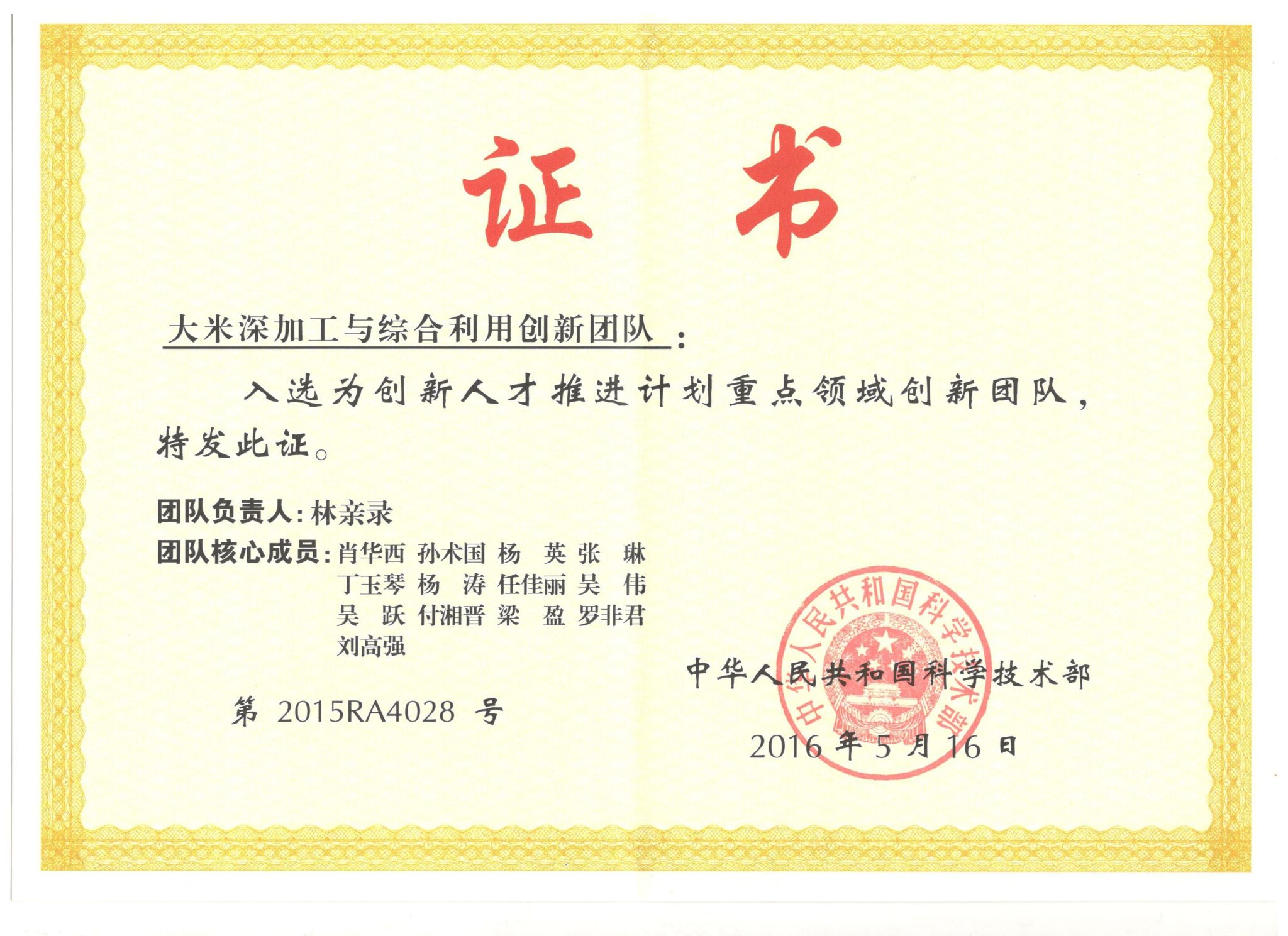 从科技部获悉,我校食品科学与工程学院林亲录教授牵头申报的大米深加工与综合利用创新团队入选为创新人才推进计划重点领域创新团队。这是我校第一个国家级创新团队,是我校科研领域又一重大喜讯。林亲录教授牵头的团队在粮食深加工领域先后获国家科技进步二等奖1项,湖南省科技进步一等奖3项,申报国家发明专利50多项,发表学术论文300多篇,多项技术在企业推广产生了良好的经济效益和社会效益。该团队入选为创新人才推进计划重点领域创新团队,标志着我校在该领域的研究得到社会和同行的高度认可。